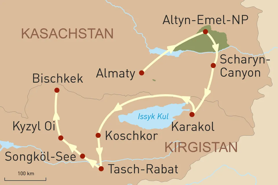Diese Reise anfragenID: 67497Im Herzen von Zentralasien, einem wahren Treffpunkt der Kulturen, bestechen die beiden Länder Kasachstan und Kirgistan mit einer einzigartigen Mischung aus atemberaubenden Landschaften, kultureller Vielfalt und wohlbehüteten Traditionen. Während Sie mit Almaty und Bishkek aufstrebende Städte erleben, offenbaren sich in abgelegenen Gebirgsregionen und weiten Steppen Abgeschiedenheit und Einblicke in die Naturlandschaften Zentralasiens und die reiche Kultur der Nomadenvölker Kirgistans.