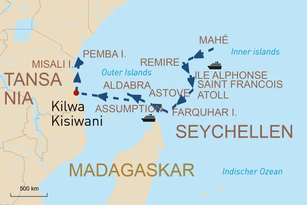 Diese Reise anfragenID: 71070Eine unvergessliche Reise erwartet Sie: Sie fliegen zunächst nach Mahé, wo Sie drei Nächte in einem luxuriösen Resort verbringen. Erkunden Sie die tropische Bergwelt, bunte Märkte und paradiesische Strände. Anschließend geht es an Bord der Aqua Lares zu einer exklusiven Kreuzfahrt durch die Inselwelt der Outer Islands der Seychellen bis zur Gewürzinsel Sansibar. Zum Abschluss genießen Sie Tage voller Entspannung.