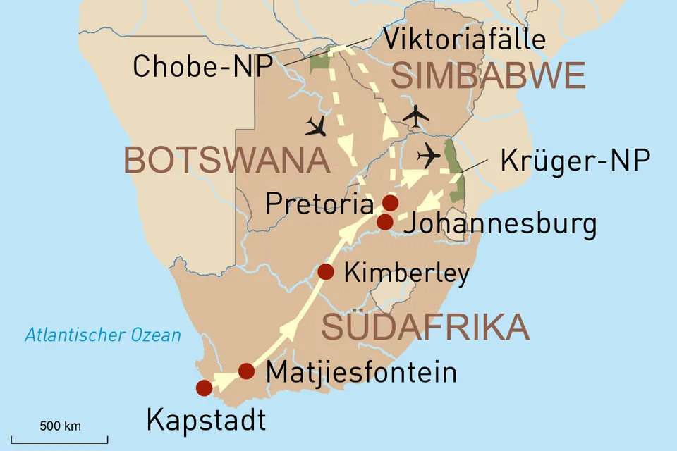 z. B. 20-tägige Privatreise nach Südafrika, Botswana und zu den Viktoriafällen inklusive Fahrt mit dem Rovos Rail