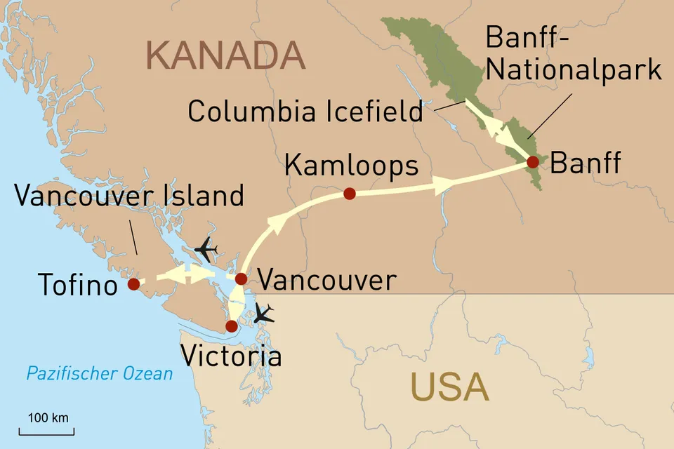 in Ihrer luxuriösen Unterkunft. Am frühen Nachmittag erfolgt der Transfer zum Flughafen Tofino und die Rückreise nach Vancouver. Tag 7 Tagesausflug Victoria Am Morgen werden Sie in Ihrem Hotel abgeholt und zum Flughafen gefahren, wo Ihr Flug mit dem Wasserflugzeug nach Victoria erfolgt. Erkunden Sie am heutigen Tag die vielen Facetten der Hauptstadt British Columbias, z.B. bei einem Spaziergang entlang des Inner Harbour’s oder durch den wunderschönen Beacon Hill Park oder bei einem Besuch des Royal BC Museums. Nicht zuletzt durch die herrliche Lage an der Südspitze von Vancouver Island hat sich Victoria zu einem der beliebtesten Reiseziele im Westen Kanadas entwickelt. Am Nachmittag fliegen Sie vom Hafen Victorias zurück nach Vancouver mit anschließendem Transfer zu Ihrem Hotel. Tag 8 Vancouver Nutzen Sie den verbleibenden Tag für weitere Erkundungen in Eigenregie und spazieren Sie beispielsweise durch den Stanley Park oder unternehmen Sie einen Ausflug zur beeindruckenden Capilano-Hängebrücke. Tag 9 Fahrt mit dem Rocky Mountaineer Nach dem Transfer zum Bahnhof startet Ihr zweitägiges Zugerlebnis an Bord des Panoramazugs Rocky Mountaineer. Es gibt wohl kaum eine komfortablere und eindrucksvollere Art, um die Schönheit der kanadischen Rocky Mountains zu genießen. Freuen Sie sich auf die Annehmlichkeiten des Zuges und die wohltuende Entschleunigung. Der Zug fährt nur bei Tag, sodass Ihnen kein Highlight entgehen wird. Schlafabteile gibt es nicht, stattdessen übernachten Sie bequem im Hotel. Die heutige Etappe führt vorbei am Fraser River und den rauschenden Wassern von Hell’s Gate bis nach Kamloops, wo Sie nach Ihrer Ankunft in Ihr Hotel gebracht werden. (F M) Tag 10 Weiterfahrt nach Banff Heute geht die abwechslungsreiche Fahrt mit dem Rocky Mountaineer weiter in Richtung Osten, vorbei an den malerischen Seen der Shuswap Region. Mit zunehmenden Höhenmetern wandelt sich auch die Landschaft und Sie sehen sich schließlich umgeben von spektakulären Bergmassiven wie dem markanten Castle Mountain. In Banff endet Ihre Zugfahrt. (F M) Tag 11 Ausflug zum Icefields Parkway Heute unternehmen Sie einen Ganztagesausflug zum berühmten Icefields Parkway. Ein Highlight des heutigen Tages ist die Fahrt zum Columbia-Icefield, einer gigantischen Eisansammlung in Form mehrerer Gletscher wie dem Athabasca-Gletscher. Ein aussichtsreicher Spaziergang auf dem Glacier Skywalk wird sicherlich unvergesslich! Tag 12 Lake Louise und Moraine Lake Ein tolles Farbspiel erwartet Sie bei einem Besuch des beliebten Moraine Lake und des Lake Louise mit ihren türkisfarbenen Wassern. Letztgenannter beherbergt mit dem Fairmont Chateau ein einzigartig gelegenes Hotel mit fantastischem Ausblick. Im Anschluss empfiehlt sich eine Fahrt mit der Banff-Gondola auf den Sulphur Mountain. Tag 13 Abreise Am heutigen Tag heißt es Abschied nehmen von Westkanada. Ihr Fahrer holt Sie am Hotel ab und bringt Sie zum Flughafen von Calgary. Rückflug. Tag 14 Ankunft