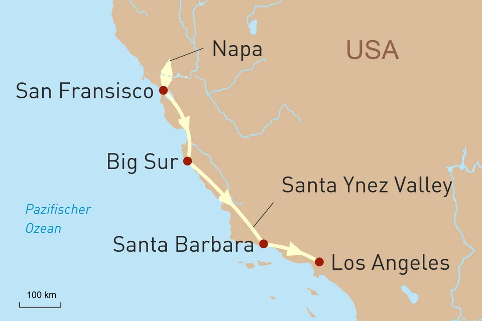 Diese Reise anfragenID: 54465Während dieser erlebnisreichen Privatreise werden wahrlich Träume wahr – erleben Sie exklusive Highlights Kaliforniens aus der Luft, zu Wasser und an Land. Sie genießen in Ihrem Cabrio den legendären Highway Nr. 1, eine der schönsten Küstenstraßen der Welt, welche den Norden mit dem Süden Kaliforniens verbindet. Freuen Sie sich auf palmengesäumte Strände, traumhafte Ausblicke auf den Pazifik und gigantische Mammutbäume. Sie kosten köstliche Weine, dinieren in exquisiten Restaurants, gehen auf Tuchfühlung mit Walen und Delfinen, blicken hinter die Kulissen bekannter Hollywood-Produktionen und können bei einem gemütlichen Ausritt einfach mal die Zeit vergessen.