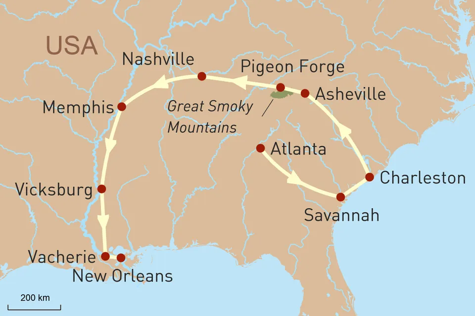 Diese Reise anfragenID: 53924Schlendern Sie entlang der von Eichen gesäumten Allee zum prächtigen Herrenhaus der Oak Alley Plantage, genießen Sie köstliche Shrimps in Charleston und die malerischen Ausblicke bei einer Fahrt auf dem Blue Ridge Parkway. Tauchen Sie ein in die vielfältige Musikszene des Jazz, Rock, Country und Blues: Die Südstaaten der USA besitzen einen reichhaltigen und einzigartigen Kulturmix. Sie wandeln auf den Spuren der amerikanischen Geschichte und entdecken historisch geprägte Städte wie Savannah und New Orleans. Bei einer Fahrt entlang des imposanten Mississippi oder der Atlantikküste können Sie den Großstadttrubel hinter sich lassen.