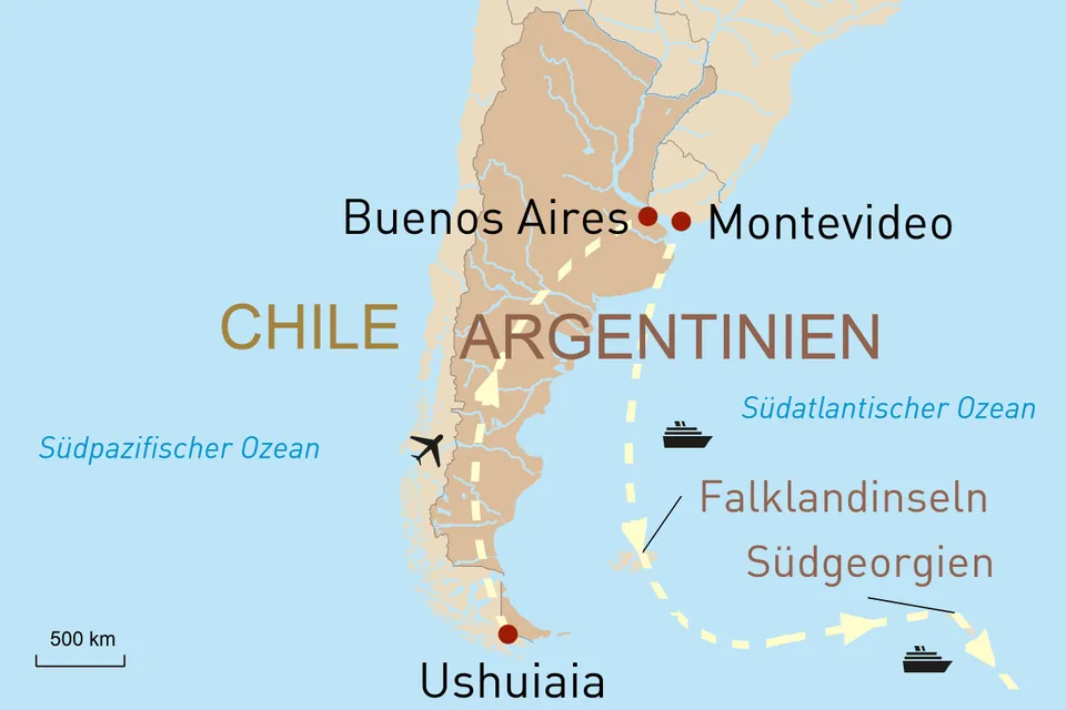 - Transfers und Stadtrundfahrt in Montevideo und Buenos Aires im privaten, klimatisierten Fahrzeug mit deutschsprachiger Reiseleitung