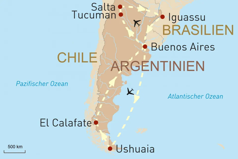 Diese Reise anfragenID: 51348Argentinien ist ein Land der Superlative und bedeckt eine Fläche von knapp 3 Millionen Quadratkilometern. Es dehnt sich ca. 3.700 Kilometer von Norden nach Süden und 1.400 Kilometer von Westen nach Osten aus. Im Norden reicht es an die tropischen Urwälder Brasiliens, Paraguays und Boliviens, im Süden bilden die Felsen von Kap Hoorn die Spitze eines ganzen Erdteils. Auf der Reise verweilen Sie unter anderem im „Paris von Südamerika“ – Buenos Aires, berühmt für sein kulturelles Leben. Die Natur zeigt sich in allen Facetten mit einem der größten Wasserfälle der Welt in Iguassu, den bunten Felsbergen von Salta, dem sturmumtosten Feuerland und den Gletscherwelten in Calafate.