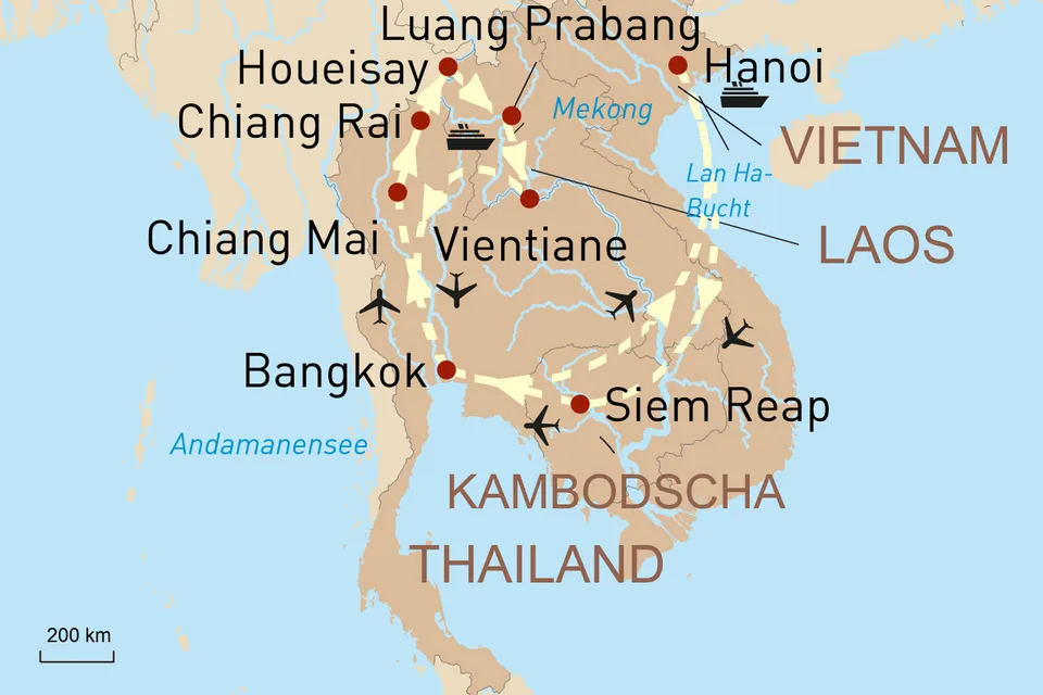Heute beginnt Ihre Flusskreuzfahrt auf dem größten Fluss Südostasiens. Genießen Sie auf Ihrer Fahrt zur laotischen Grenze die atemberaubende Natur, ehe Sie, angekommen am Hafen von Houeisay, an Bord der Heritage Line 'Anouvong' gehen. Während Sie sich mit Ihrer Kabine und dem Schiff vertraut machen, folgt die Heritage Line 'Anouvong' dem mächtigen Mekong flussabwärts. Im Dorf Huay Palang erhalten Sie bereits heute einen ersten Einblick in die ethnische Vielfalt von Laos und die Lebenswelt der Menschen am Fluss. Während die Sonne über dem Mekong untergeht, tauchen Sie mit einer Baci-Zeremonie tief in die Tradition des Landes ein. (F M A)
