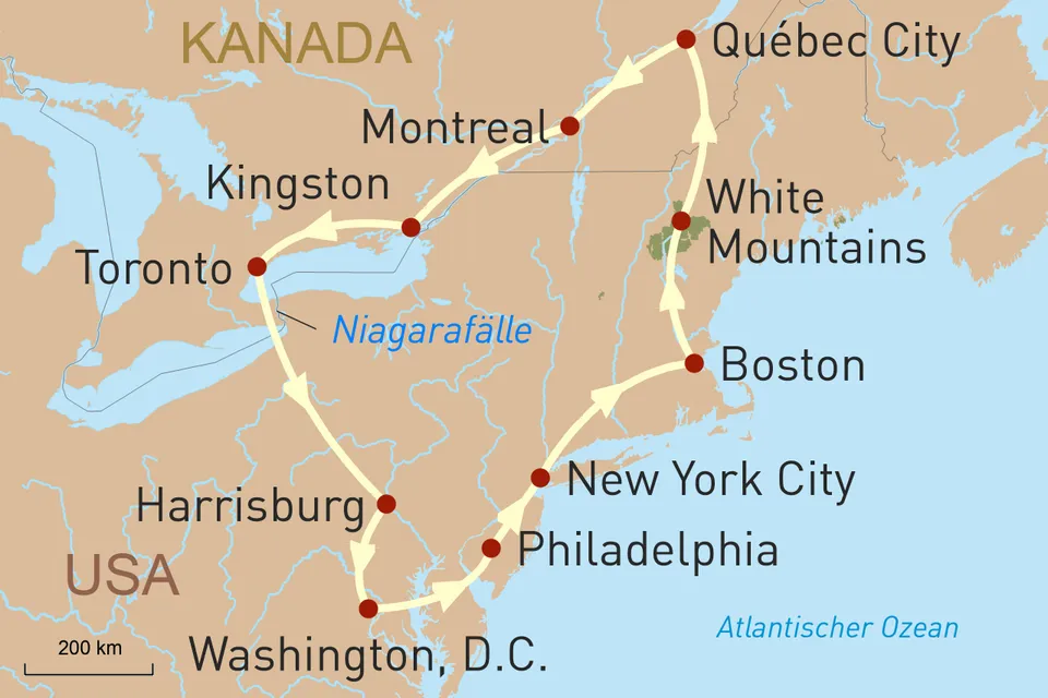 Diese Reise anfragenID: 64042Die größten Städte der amerikanischen Ostküste lassen Sie tief in die Kulturen der einzelnen Regionen eintauchen und erzählen von der Geschichte beider Länder. New York City wartet mit unvergleichlichen Häuserschluchten und weltberühmten Sehenswürdigkeiten auf. Zahlreiche Museen und Denkmäler bedienen in Washington, D.C. jedweden Geschmack. Boston verzaubert als großes Freilichtmuseum in den USA ebenso wie Québec City in Kanada. Das pulsierende Toronto liegt nicht weit entfernt von den tosenden Niagarafällen und in den White Mountains von Vermont warten zahlreiche Wanderwege und eine malerische Berglandschaft darauf, von Ihnen erkundet zu werden.