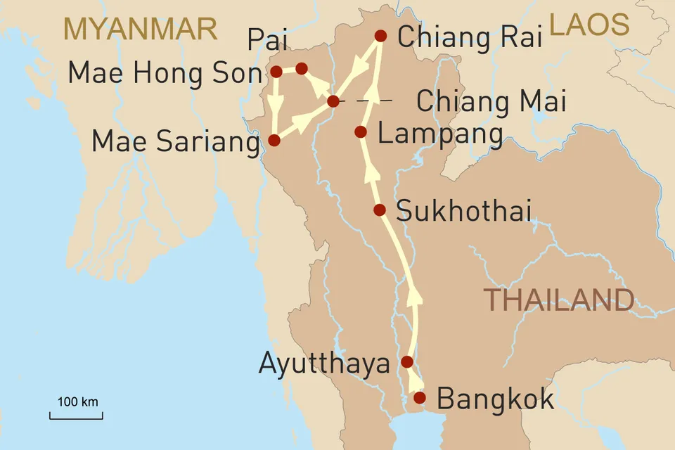 Anschließend übernehmen Sie das Steuer und tauchen ein in das königliche Erbe Thailands mit den UNESCO-Weltkulturerbestätten Ayutthaya und Sukhothai. Weiter nördlich erwarten Sie die kulturellen Schätze von Chiang Rai, das legendäre Goldene Dreieck und Chiang Mai, auch bekannt als die „Rose des Nordens“. Ein besonderer Höhepunkt Ihrer Reise ist die legendäre Mae-Hong-Son-Schleife: 1 864 Kurven führen Sie durch spektakuläre Bergwelten, vorbei an Wasserfällen, heißen Quellen und ursprünglichen Dörfern der Bergvölker. Eine Reise, die authentische Begegnungen und unvergessliche Natureindrücke verspricht.