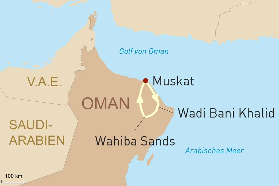 Tag 5 Tag der Entspannung Ein weiterer Tag zur Erholung am Strand. (F) Tag 6 Gebirge, Wüste und Wadi Mit dem Geländewagen fahren Sie durch das Hadjar-Gebirge. und weiter zum Wadi Bani Khalid, eines der schönsten Wadis des Landes. Die grüne Oase ist charakterisiert von den zahlreichen Dattel- und Palmplantagen. Gebirgsbäche ergießen sich in malerische Süßwasserpools, die zum Baden einladen. Anschließend erwartet Sie eine aufregende Fahrt durch honiggelbe Sanddünen in der Wahiba Sands-Wüste, wo Sie einen kurzen Einblick in die Lebensweise der Beduinen erhalten. (F M) Tag 7-8 Relaxen in Muscat Genießen Sie zum Ende Ihrer Oman Reise noch einmal Sonne, Sand und Meer! (F)