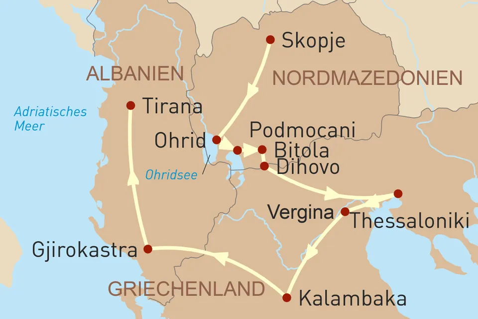 Diese Reise anfragenID: 69436In nur einer einzigen, spannenden Reise erleben Sie die ganze Vielfalt des sonnigen Balkans. Die Entdeckungstour durch Nordmazedonien, Albanien und Griechenland spricht alle Sinne an und verspricht eine faszinierende Mischung aus kulinarischen Genüssen, bewegter Geschichte, herzlicher Gastfreundschaft und atemberaubender Natur. Jeder Tag erzählt eine neue Geschichte – von alten Tempeln bis zu lebendigen Märkten, von geschichtsträchtigen Orten bis zu malerischen Landschaften. Tauchen Sie ein in die kulturellen Schätze der Region, begegnen Sie den herzlichen Menschen, stoßen Sie mit einem Glas Rakija an und kosten Sie hausgemachte Spezialitäten.