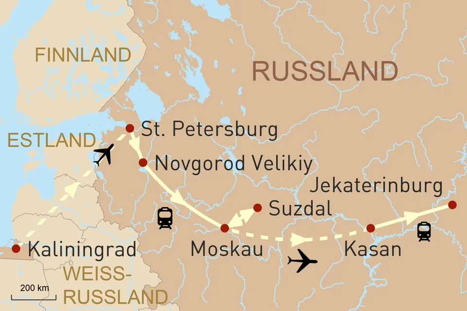 z.B. 17-tägige Privatreise durch Russland von der Ostseeküste bis an die Grenze zu Asien