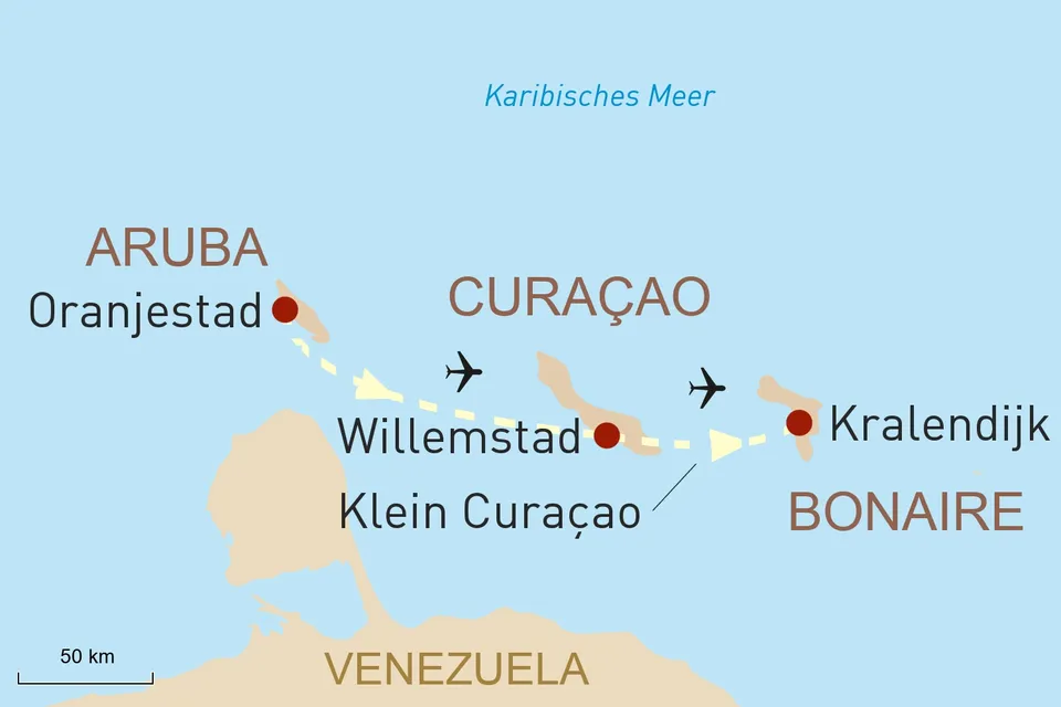 Diese Reise anfragenID: 44101Vergessen Sie auf dieser Reise in die südliche Karibik für zwei Wochen Ihren Alltag. Lassen Sie sich verzaubern von traumhaften Stränden und wilder Landschaft und schwelgen Sie in karibischer Leichtigkeit! Ihre Reise beginnt auf Aruba, wo Sie neben der hübschen Hauptstadt Oranjestad auch das Inselinnere erkunden. Weiter geht es auf die Nachbarinsel Curaçao. Auch hier finden sich eine bunte, niederländisch geprägte Hauptstadt sowie eindrucksvolle Landschaften. Ein Tagesausflug mit dem Katamaran führt Sie auf die unbewohnte Insel Klein Curaçao. Bonaire macht das Inseltrio schließlich perfekt: schneeweiße Salzberge und die vielen Flamingos werden Sie begeistern.