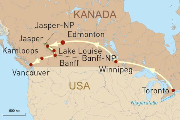 Den Höhepunkt der Tour bildet eine Bootsfahrt (nicht privat) zu den Fällen, achten Sie auf wasserdichte Kleidung! (M) Tag 3-5 Bahnfahrt The Canadian Am Bahnhof wartet der Transkontinentalzug The Canadian auf Sie. Entlang der klassischen Route The Great Western Way erleben Sie Kanada in den nächsten Tagen aus der besonderen Perspektive Ihres Komfortzuges. Vorbei an den Great Lakes, ausufernden Wäldern und den endlosen Graslandschaften der Great Plains durchqueren Sie die Provinzen Ontario, Manitoba und Saskatchewan. Neben Ihrer eigenen Kabine bieten die verschiedenen Aussichtswagen besonders schöne Ausblicke auf die vorbeiziehenden Panoramen. Für das leibliche Wohl sorgt die exzellente Küchencrew des Zuges. (2 x F, 3 x M und A) Tag 6 Ankunft in Jasper Heute erreicht Ihr Zug Jasper in der Provinz Alberta. Nach der Ankunft werden Sie zum Hotel gefahren. Jasper liegt mitten im gleichnamigen Nationalpark auf 1.062 m Höhe. Der Ort hat nur etwa 3.500 Einwohner, wird jedoch jährlich von vielen Besuchern als Ausgangsort für Erkundungen des Nationalparks genutzt. Es findet sich also eine gute Infrastruktur mit Restaurants und Geschäften. Tag 7 Jasper-Nationalpark Heute sind Sie eingeladen, den Jasper-Nationalpark auf eigene Faust zu erkunden oder sich im Hotel und der Kleinstadt Jasper gemütlich die Zeit zu vertreiben. Empfehlenswert ist ein Besuch des wunderschönen Maligne Lake mit seinem charakteristischen roten Bootshaus und der kleinen Insel Spirit Island. Tag 8 Icefields Parkway Discovery Tour von Jasper nach Lake Louise Der heutige Tag steht gänzlich im Zeichen eines besonderen Highways: Von Jasper aus führt der Icefields Parkway nach Süden in Richtung Banff. Diese rund 230 Kilometer lange Straße gilt zurecht als eine der schönsten weltweit. Per Bus folgen Sie dem Weg vorbei an zahllosen imposanten Ausblicken. Eines der Highlights auf der Route ist das Columbia Icefield, eine gigantische Eisansammlung in Form mehrerer Gletscher wie dem Athabasca Gletscher. Dieser ist auch das Ziel der Ice Explorer Tour, die Sie mit einem speziellen Fahrzeug direkt auf das Eis bringt. Schwindelfreie dürfen anschließend einen Gang über den Skywalk genießen. Am Nachmittag/Abend erreichen Sie Ihr Hotel in Lake Louise. Das Fairmont Chateau ist aufgrund seiner malerischen Lage am Louise eines der zweifellos meistfotografierten Hotels. Tag 9 Banff Heute erfolgt die Weiterfahrt von Lake Louise bis nach Banff. Nach dem Einchecken im Hotel können Sie das gemütliche Banff im gleichnamigen Nationalpark erkunden. Es handelt sich hierbei um den ältesten Nationalpark Kanadas. Mit der Banff Gondola fahren Sie zum Beispiel auf den Sulphur Mountain und können vom Bergkamm aus die spektakuläre Aussicht genießen. Ein tolles Farbspiel erwartet Sie bei einem Besuch der Bergseen. Hervorzuheben ist hier neben dem bereits besuchten Lake Louise auch der Moraine Lake. Im Johnston Canyon lohnt eine Wanderung über Holzbrücken durch die Schlucht, während der man auf mehrere Wasserfälle mit türkisfarbenem Wasser trifft. Tag 10 Sightseeing in Banff Am Vormittag präsentiert Ihnen eine geführte Tour die schönsten Seiten von Banff. Dabei erfahren Sie viel Wissenswertes über die geologische Geschichte des Nationalparks und die prächtige Tier- und Pflanzenwelt. Tag 11-12 Zugabenteuer mit dem Rocky Mountaineer Heute gehen Sie an Bord des berühmten Rocky Mountaineer. Dieser Zug reist nur tagsüber, damit Sie die grandiose Aussicht auf die Gebirgslandschaften uneingeschränkt genießen können. Großzügige Panoramafenster gewähren beste Sicht von allen Sitzplätzen in den markanten Glass-Dome Wagen. Getränke und Mahlzeiten sind an Bord ebenso inklusive, wie die interessanten Erläuterungen der Reiseleiter während der Fahrt. Es gibt zudem in beiden Reiseklassen eine Außenplattform (Gold Leaf Gäste haben Zugang zu einem größeren, exklusiven Bereich). Am späten Nachmittag Ihrer ersten Fahrtetappe erreicht der Rocky Mountaineer Kamloops. Hier werden Sie für die heutige Nacht in Ihr Hotel gebracht. Durch das „Cowboy Country“ von British Columbia und entlang des Thompson and Fraser Flusses führt die zweite Etappe am nächsten Tag weiter, bis Sie schließlich die reizende Küstenmetropole Vancouver erreichen. Anschließend Transfer zu Ihrem Hotel. (F, M) Tag 13 Private Stadtführung Vancouver Ihr privater Reiseleiter erkundet mit Ihnen die wichtigsten Sehenswürdigkeiten in der Innenstadt Vancouvers. Sie können sich hierbei auf die Erfahrung des Guides verlassen oder aber Ihre persönlichen Wünsche mitteilen um eine entsprechende Tour zu planen. Tag 14 Ausflug nach Victoria Erleben Sie die berauschende Landschaft und den malerischen Charme Victorias. Von Vancouver aus führt Ihr Busausflug mit einer 95-minütigen Fährfahrt durch die malerischen Passagen der Golfinseln nach Victoria an der Südspitze von Vancouver Island. Inbegriffen ist der Besuch der Butchart Gardens, in denen exotische Blumen aus aller Welt wachsen. Erkunden Sie auf eigene Faust die Sehenswürdigkeiten der Stadt. Vielleicht nehmen Sie ein Wassertaxi, um das Stadtbild aus einer einzigartigen Perspektive zu erleben. Tag 15 Rückflug Ihre unvergessliche Reise durch Kanada neigt sich dem Ende zu. Sie werden am Hotel abgeholt und zum Flughafen von Vancouver gefahren. Von dort erfolgt der Rückflug in Ihre Heimat. Tag 16 Ankunft