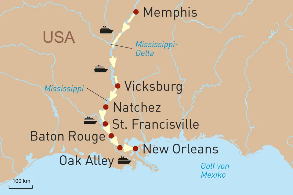 Diese Reise anfragenID: 64570Erkunden Sie die Südstaaten vom Wasser aus und entdecken Sie während der Fahrt auf dem „Ol‘ Man River“ Mississippi elegante Plantagenhäuser und viktorianische Villen, die auch gut als Kulisse für Vom Winde verweht hätten dienen können. Genießen Sie tiefe Einblicke in die nordamerikanische Geschichte und nostalgisches Flair an Bord der American Splendor, einem der schönsten Schaufelraddampfer der Welt. Den Auftakt Ihrer Reise macht ein Besuch der Heimat des Blues, der Beale Street und Elvis Presleys – Memphis. Des Weiteren genießen Sie die Raffinessen der kreolischen Küche in New Orleans und erkunden dort das historische French Quarter sowie den malerischen Garden District.