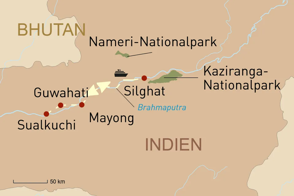Flussaufwärts geht es in Richtung Silghat, vor den Toren des Kaziranga-Nationalparks. Sie kommen in Silghat an und machen einen gemütlichen Spaziergang durch das typische assamesische Dorf. Erleben Sie den Alltag und die Traditionen der freundlichen Einheimischen. Genießen Sie abends eine faszinierende Aufführung traditioneller assamesischer Volkstänze wie Jhumur und Bihu. (F M A) Tag 4 Safari-Erlebnisse im Kaziranga-Nationalpark Begeben Sie sich auf eine aufregende Jeep-Safari durch den Nationalpark. Dieses Naturparadies beherbergt die weltweit größte Population des Indischen Panzernashorns und hat eine hohe Dichte an bengalischen Königstigern, obwohl Sichtungen dieser scheuen Tiere selten sind. Halten Sie Ausschau nach anderen faszinierenden Wildtieren wie den Indischen Elefanten, Bison, Sumpfhirsch, Kappenlangur und verschiedene Vogelarten darunter Nashornvögel und Eisvögel, während Sie die abwechslungsreiche Landschaft des Parks durchqueren. (F M A) Tag 5 Nameri-Nationalpark Nach dem frühen Frühstück begeben Sie sich auf ein aufregendes Abenteuer in den Nameri-Nationalpark. Sie unternehmen eine entspannte Floßfahrt auf dem Jia-Bhoreli-Fluss, beobachten die vielfältige Vogelwelt und genießen die atemberaubende Landschaft der blauen Hügel im östlichen Himalaya-Gebirge von Arunachal Pradesh im Hintergrund. Später fahren Sie zu den Bamuni-Hügeln und sehen die alten Felszeichnungen aus dem 8. Jh., die einen Einblick in das künstlerische Erbe der Region bieten. Nach Rückkehr an Bord geht die Fahrt flussabwärts in Richtung Mayong. (F M A) Tag 6 Mayong – Das mystische Dorf der Zauberer Heute gehen Sie im mystischen Dorf Mayong an Land. Es ist berühmt als „Dorf der Zauberer“ in Assam. Schon seit Jahrhunderten ranken sich Legenden um die magischen Künste und okkulten Praktiken, die hier gepflegt wurden. Mayong gilt als Heimat mächtiger Magier und Hexen, deren Wissen und Rituale tief in der Geschichte und Kultur der Region verwurzelt sind. Das Dorf bietet ein einzigartiges Magie-Museum, das die reiche Geschichte und Tradition der alten okkulten Praktiken lebendig hält. Tauchen Sie ein in die faszinierende Geschichte und erfahren Sie mehr über alte Mantras und ihre Anwendung in allen Bereichen, von der Heilung bis zur Diebeserkennung. Segeln Sie später weiter flussabwärts und genießen Sie die abwechslungsreiche Landschaft und die Aktivitäten an Bord (F M A). Tag 7 Seidendorf Sualkuchi Das Schiff legt im kleinen Städtchen Sualkuchi an, berühmt für die Herstellung und Verarbeitung der goldenen Muga-Seide. Schon von Weitem hören Sie das Klappern von Webstühlen. Das Dorf ist das Zentrum der Seidenwebereien in Assam. Erleben Sie den gesamten Prozess der Seidenherstellung, vom Kokon über das Spinnen und Färben, bis hin zum Handweben der exquisiten Saris (Mekhela Chador), den die einheimischen Frauen tragen. (F M A) Tag 8 Ausschiffung in Guwahati und Rückreise Die RV Kindat Pandaw erreicht wieder Guwahati, wo Ihre herrliche Brahmaputra-Flusskreuzfahrt endet. Ausschiffung am Morgen und Transfer zum Flughafen in Guwahati. (F)