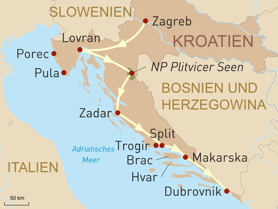 Türkis-blaues Wasser, traumhafte Strände, dichte Wälder, atemberaubende Wasserfälle und historische Städte erwarten Sie bei dieser Rundreise durch Kroatien. Im privaten Fahrzeug mit wechselndem deutschsprachigem Reiseleiter erkunden Sie die Höhepunkte dieses zauberhaften Landes an der Adria. Nach Ihrer Ankunft in Zagreb fahren Sie zunächst in die hübschen Städte Porec und Pula in Istrien. Weiter geht es zu den malerischen Plitvicer Seen, einer märchenhaft schönen Landschaft, welche von zahllosen Seen und Wasserfällen geprägt ist. Danach erwarten Sie die historischen Altstädte von Zadar und Trogir; bei einem Marktbesuch beobachten Sie das bunte Treiben. Als nächstes steht Split, die zweitgrößte Stadt Kroatiens, auf dem Programm. Besuchen Sie hier den berühmten Diokletianpalast und genießen Sie das große kulturelle Angebot. Dubrovnik, von vielen als die schönste Stadt Kroatiens bezeichnet, steht am Ende Ihrer Rundreise. Das eindrucksvolle Altstadtensemble wird Sie in vergangene Zeiten zurück versetzen. Für erholsame Strandspaziergänge und Badetage bieten sich während dieser Tour besonders die Insel Hvar, Insel Brac und die Halbinsel Lapag an.