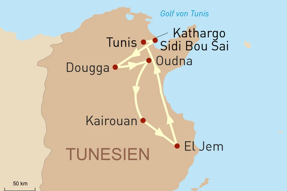Diese Reise anfragenID: 69494Entdecken Sie auf dieser Kurzreise die kulturellen Highlights Tunesiens – vom römischen Erbe bis zur islamischen Tradition. Tunis mit seiner lebendigen Medina, die Ruinen von Karthago, das Künstlerdorf Sidi Bou Said, die antiken Städte Dougga und Oudhna sowie die spirituelle Atmosphäre in Kairouan bilden die Stationen dieser kompakten Reise durch Vergangenheit und Gegenwart. Zwischen UNESCO-Welterbestätten, weiß-blauen Gassen, monumentalen Amphitheatern und orientalischen Altstädten erleben Sie Tunesien in all seiner Vielfalt – intensiv, eindrucksvoll und voller kultureller Tiefe.