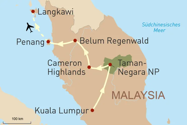 Diese Reise anfragenID: 39860Wenn Sie gerne individuell und unabhängig reisen, dann ist diese Mietwagenreise durch Malaysia genau das Richtige für Sie. Immergrünes Hochland, Kulturreichtümer, Jahrtausende alte Regenwälder, strahlend weiße Sandstrände - all dem und vielem mehr begegnen Sie auf dieser Reise. Die Metropole Kuala Lumpur ist ein Schmelztiegel der Kulturen. Erkunden Sie anschließend den Jahrmillionen alten Taman Negara-Nationalpark, die Gebirgskette der Cameron Highlands, den vielfältigen Belum Rainforest und das UNESCO-Weltkulturerbe Penangs. Ihre Malaysia Mietwagenreise beenden Sie auf Langkawi, ein kleines Inselparadies mit bezaubernder Natur und traumhaften Stränden.