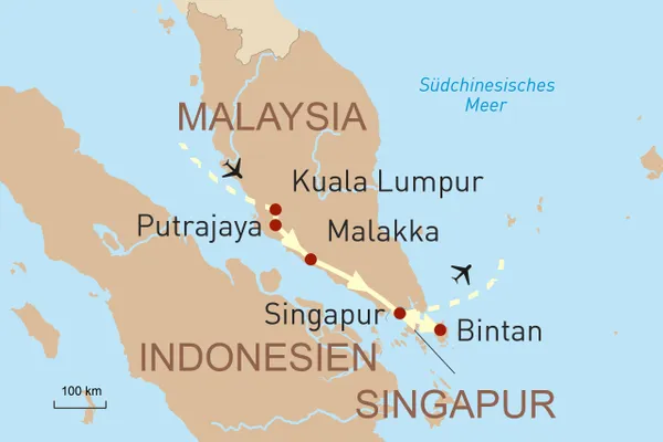 Diese Reise anfragenID: 56142Zwischen Luxus und Tradition tauchen Sie auf dieser exklusiven Reise in die Wunder von Malaysia und Singapur ein. Besuchen Sie futuristische Bauten und uralte Pilgerstätten in Kuala Lumpur, entdecken Sie die Putrajaya bei einer Heißluftballonfahrt aus atemberaubender Höhe und lassen Sie sich in der malerischen Küstenstadt Malakka von der einzigartigen Architektur bezaubern. In der pulsierenden Weltstadt Singapur erwarten Sie verschiedenste Kulturen, modernste architektonische Meisterwerke und eine Welt des Luxus, die ihresgleichen sucht. Auf der vorgelagerten Insel Sentosa findet Ihre Reise schließlich in einem luxuriösen Resort ihren krönenden Abschluss.