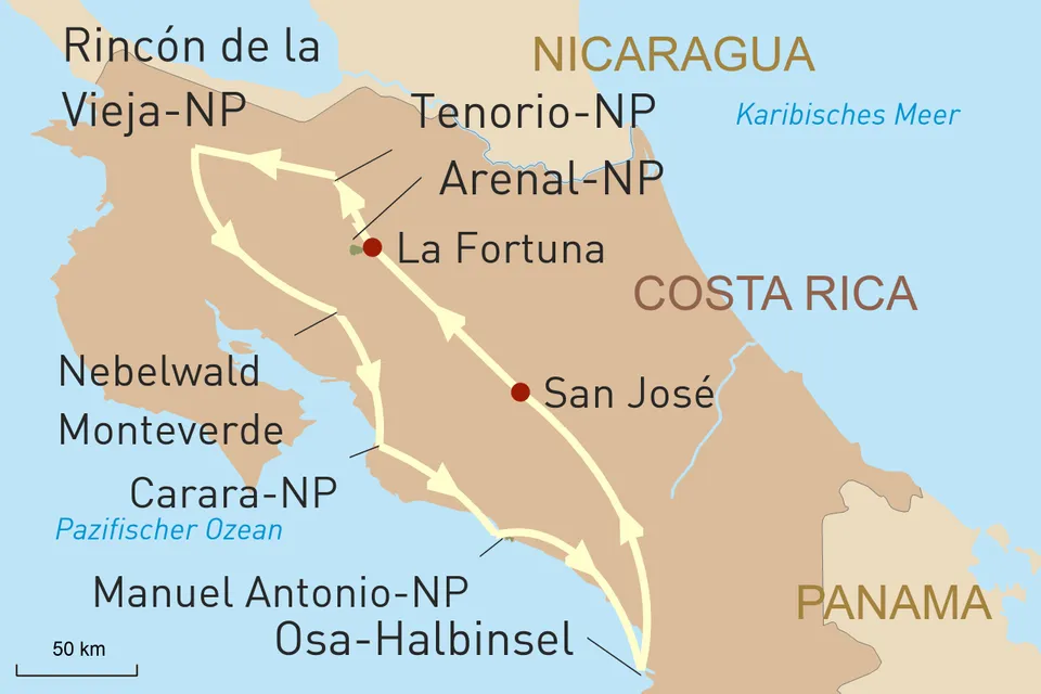 Ein Viertel des kleinen paradiesischen Fleckchen Erde zwischen Panama und Nicaragua steht unter Naturschutz, seine Landschaft fasziniert mit dichten Nebel- und Regenwäldern, Vulkanen, rauschenden Wasserfällen, kostbaren Nationalparks und bilderbuchgleichen Traumstränden. Sie erkunden rauchende Vulkane, wandern vorbei an blubbernden Schlammlöchern und blauschimmernden Flüssen, sind im Nebelwald auf Hängebrücken mit den Baumkronen und ihren Bewohnern „auf Du und Du“, beobachten Brüllaffen, Faultiere und Leguane und erfreuen sich an Vögeln in allen Farben. Entspannung und Schnorcheln an palmengesäumten Stränden sind weitere Highlights.