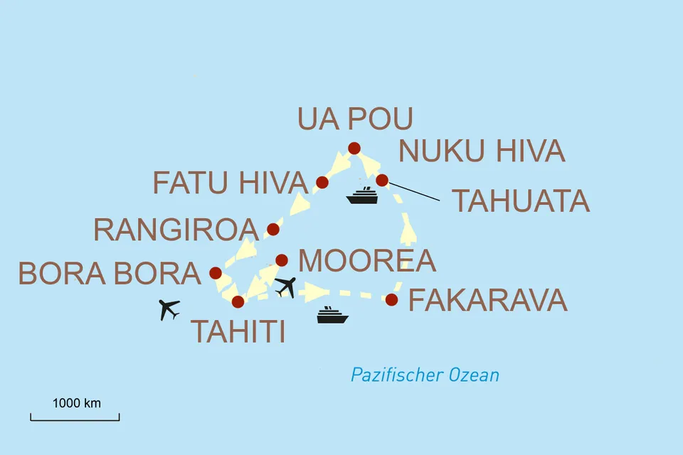 Diese Reise anfragenID: 66638Erleben Sie die Magie Polynesiens zu Lande und zu Wasser. Eine traumhafte Kreuzfahrt an Bord des Passagier- und Versorgungsschiffes Aranui 5 präsentiert Ihnen die bezaubernde Inselwelt zwischen Tahiti und den Marquesas-Inseln und führt Sie mitten in das Herz der polynesischen Kultur. Umrahmt wird Ihr Kreuzfahrterlebnis von paradiesischen Tagen an Land auf Moorea und Bora Bora. Freuen Sie sich auf kristallklare Buchten und Landschaften, welche an die Südseemalereien von Paul Gauguin erinnern.