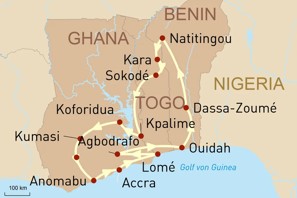Ihre Reise führt Sie weiter von Kara nach Sokode in Togo. Hier besuchen Sie die Kabye, eine ethnische Gruppe, die durch Mauern verbundenen Lehmhütten wohnt. Die Frauen betreiben traditionelle Töpferei, während die Männer als Schmiede arbeiten. Am Abend erreichen Sie ein Dorf der Tem, wo Sie einem Feuertanz zusehen können. (F M A)