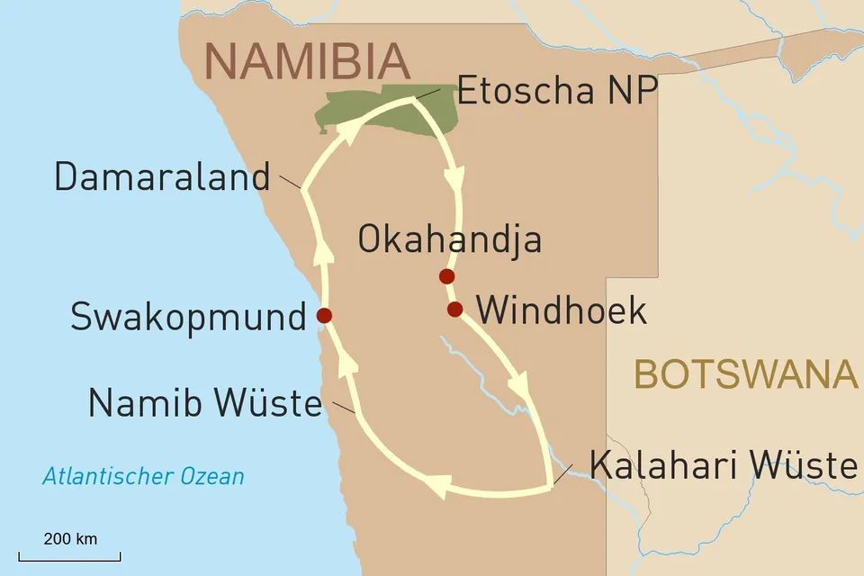Diese Reise beginnt zunächst im kolonialen Windhoek und führt Sie weiter in die tierreichen Weiten der Kalahari. Anschließend erleben Sie die höchsten Dünen der Welt im Sossusvlei sowie idyllische Kleinstadtatmosphäre in Swakopmund. Im Damaraland staunen Sie über die Felsgravuren von Twyfelfontein, bevor es weitergeht in den berühmten Etoscha-Nationalpark. Auf ausgiebigen Pirschfahrten beobachten Sie hier mit etwas Glück Elefanten, Löwen, Giraffen, Nashörner und andere Tiere in ihrer natürlichen Umgebung. Ein unvergesslicher Moment!