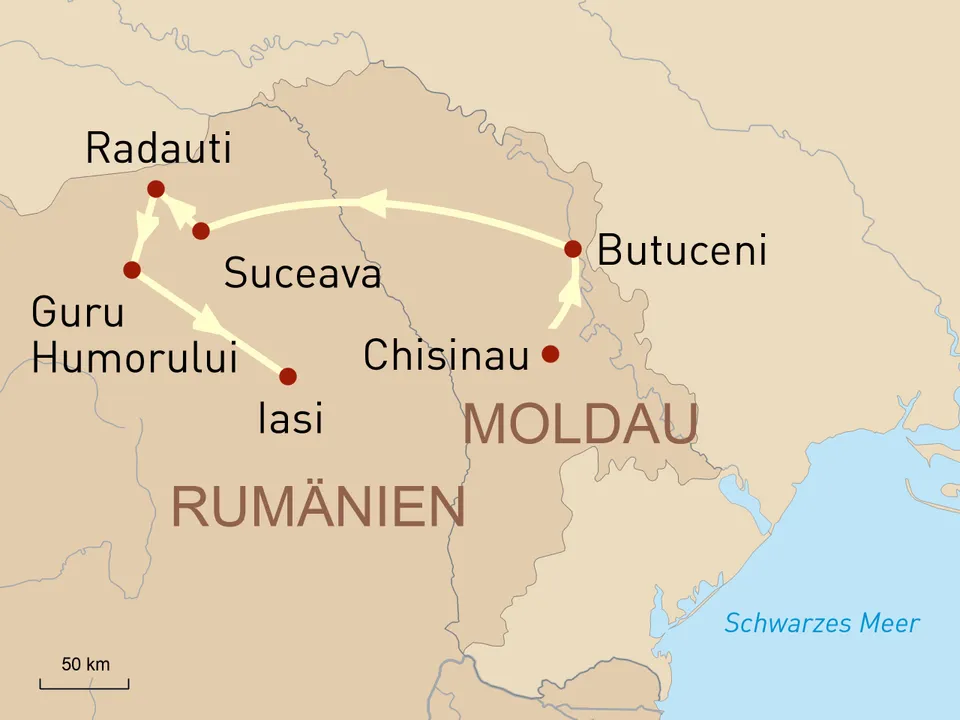 Nach dem heutigen Frühstück erhalten Sie eine kurze Einführung in die bevorstehenden Highlights des heutigen Tages. Ihre erste Station führt zur Suceava-Festung, einer imposanten mittelalterlichen Burg, die im 14. Jahrhundert erbaut wurde. Als Residenz der moldawischen Fürsten spielte sie eine Schlüsselrolle bei der Verteidigung des Fürstentums Moldawien. Trotz zahlreicher Belagerungen blieb sie über lange Zeit hinweg unbesiegbar und ist heute ein bedeutendes historisches Wahrzeichen. Anschließend setzen Sie Ihre Reise fort und besuchen das Arbore Kloster, ein UNESCO-Weltkulturerbe aus dem 16. Jahrhundert. Bekannt für seine beeindruckenden Außenfresken, die noch heute die Mauern zieren, wurde das Kloster 1503 von Luca Arbore, einem moldawischen Adligen, gegründet. Es bietet einen faszinierenden Einblick in die Kunst und Architektur der damaligen Zeit. In Marginea erleben wir die einzigartige Kunst der Schwarzen Töpferei. Diese traditionelle Handwerkskunst wird noch immer mit einer speziellen Brenntechnik ausgeübt, die den Töpferwaren ihre charakteristische schwarze Farbe verleiht. Bei einem Besuch in der Töpferei haben Sie die Möglichkeit, mehr über diese jahrhundertealte Tradition zu erfahren und die kunstvollen, handgefertigten Stücke zu bewundern. Der Höhepunkt des Tages ist ein Besuch des Putna Klosters, einem der bedeutendsten spirituellen und kulturellen Zentren Rumäniens. Das Kloster wurde 1466 von Stephan dem Großen gegründet und ist heute ein wichtiger Wallfahrtsort. Die grandiose Architektur und wertvollen religiösen Schätze machen den Ort zu einem unvergesslichen Erlebnis. Schließlich geht es weiter in die Stadt Radauți zu Ihrer nächsten Unterkunft. (F M)
