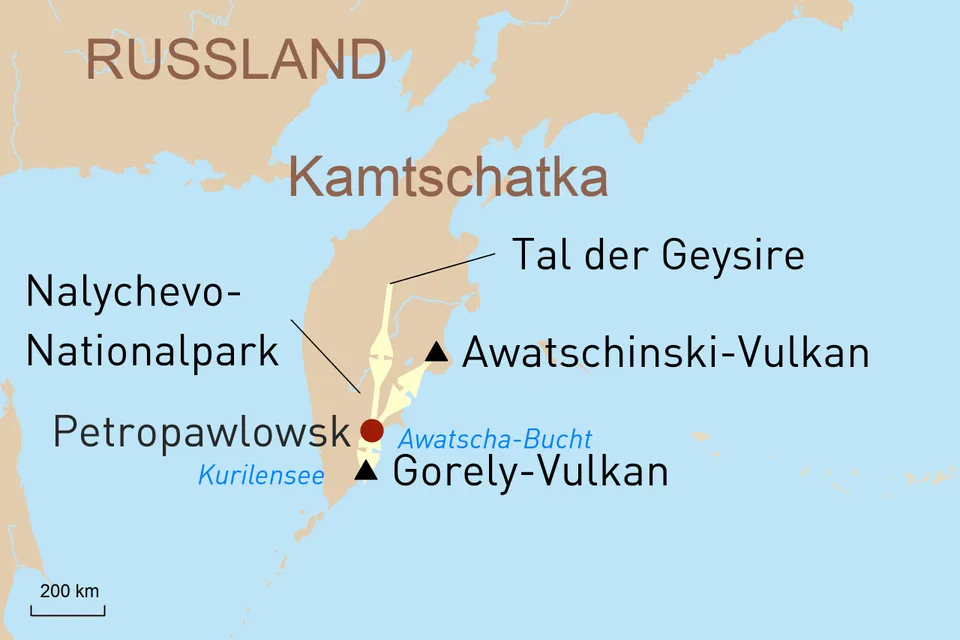 Diese Reise anfragenID: 53706Kamtschatka, die riesige Halbinsel am östlichsten Rand des eurasischen Kontinents, gilt als einer der letzten „weißen Flecken“ auf der Landkarte. Endlose Wälder, spektakuläre Vulkanlandschaften und einsame Bergseen machen die Region zu einem Paradies für Aktivreisende und Abenteuerlustige. Auf dieser Reise entdecken Sie die Höhepunkte Kamtschatkas, ohne auf einen hohen Reisekomfort verzichten zu müssen. Die Nächte verbringen Sie in Hotels, so dass Sie stets ausgeruht in den Tag starten. Tagsüber stehen Ihnen ein privates Geländefahrzeug sowie ein professioneller Outdoor-Reiseleiter zur Verfügung. Freuen Sie sich außerdem auf einen Helikopterflug durch das Tal der Geysire und eine Rafting-Tour auf dem „Bärenfluss“ Bystraja.