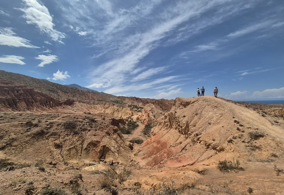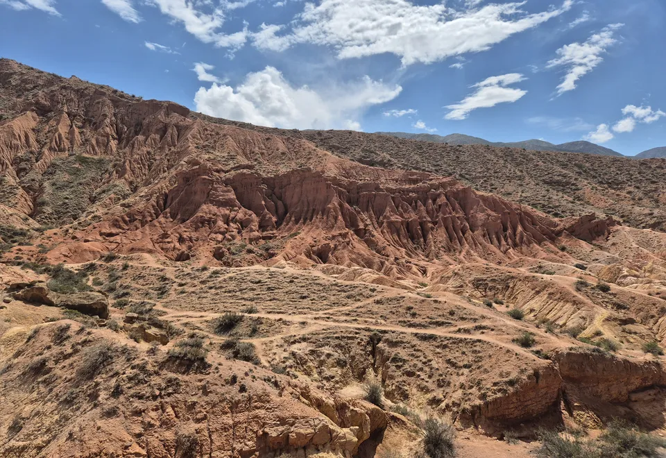 Die Vielfalt der kirgisischen Natur zeigt sich auch in der Märchenschlucht („Skazka“), eine surreal wirkende Landschaft aus bizarren, erodierten Sandsteinformationen, die wie aus einer anderen Welt wirken. Die Farben und Formen erinnern an eine Märchenlandschaft, die zum Erkunden einlädt.