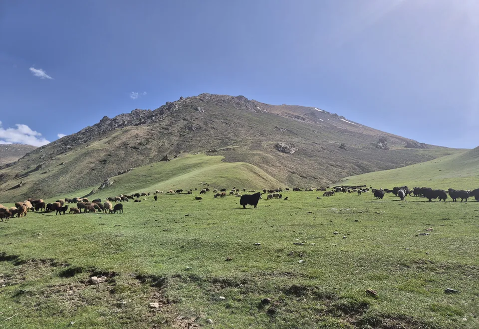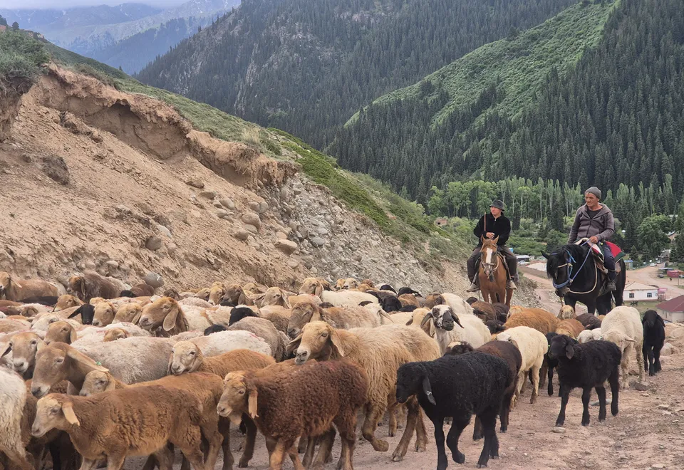 Der Grenzübergang am Grenzposten Karkyra ist schnell und völlig unproblematisch. Schon gleich nach dem Grenzübertritt begegnen uns große Schafherden, die auf die Sommerweiden getrieben werden. Bis heute werden in Kirgistan nomadische Traditionen gelebt. Viele Menschen leben weiterhin in Jurten und ziehen mit ihren Herden durch die Berge. Die Landwirtschaft, vor allem die Schafzucht, spielt eine wichtige Rolle im Alltag. Tatsächlich gibt es im Land mehr Schafe als Menschen.