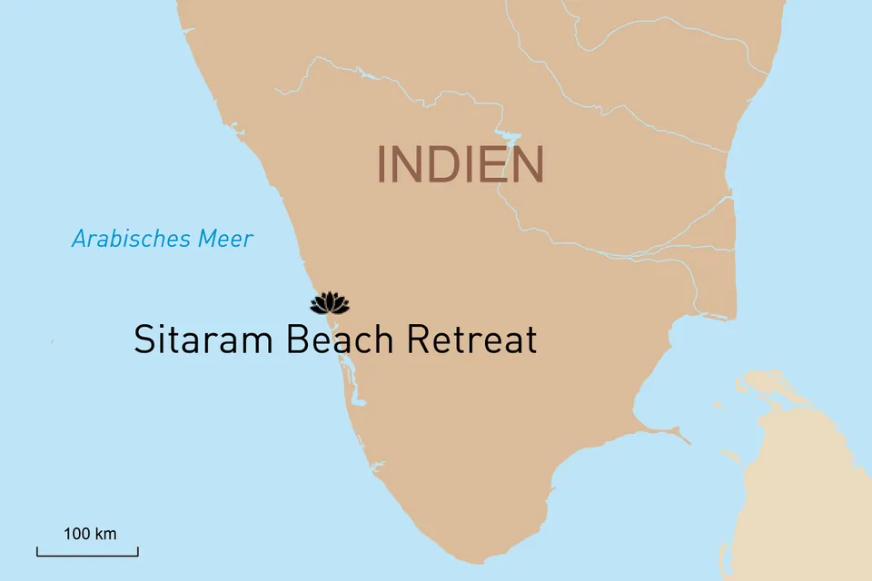 Das Sitaram Beach Retreat liegt am langen mit Palmen gesäumten Sandstrand von Nattika an der Malabar-Küste im Norden Keralas direkt am Meer. Es ist vom Flughafen Cochin mit dem Auto in etwa 90 Minuten zu erreichen.