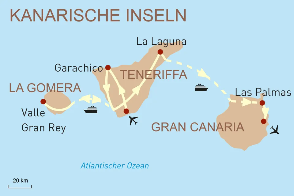 Diese Reise anfragenID: 41522Sie scheinen kaum noch zu Europa zu gehören, die spanischen Kanaren, die vor der Nordwestküste Afrikas als "Inseln des ewigen Frühlings" mit einer einzigartigen Vielfalt locken. Von weiten Stränden bis hinauf zu den schneebedeckten Gipfeln der Vulkane, von der üppigen Vegetation des Urwalds über unwirkliche Wüstenlandschaften bis zu rauen Klippen, die sich aus dem stürmischen Atlantik erheben - in ihrer ursprünglichen Natur wird jede der Kanarischen Inseln zu einer ganz eigenen Art eines Paradieses. Ausgehend von Teneriffa, dem Herzstück der Kanaren, entdecken Sie das Archipel auf dieser Mietwagenreise ganz individuell und privat nach Ihren persönlichen Vorlieben. Ob hoch oben am Teide, ob in den verwunschenen Lorbeerwäldern von La Gomera oder unterwegs zu den kulturellen Schätzen Gran Canarias: Die Kanarischen Inseln halten für jeden Geschmack das richtige Erlebnis bereit.