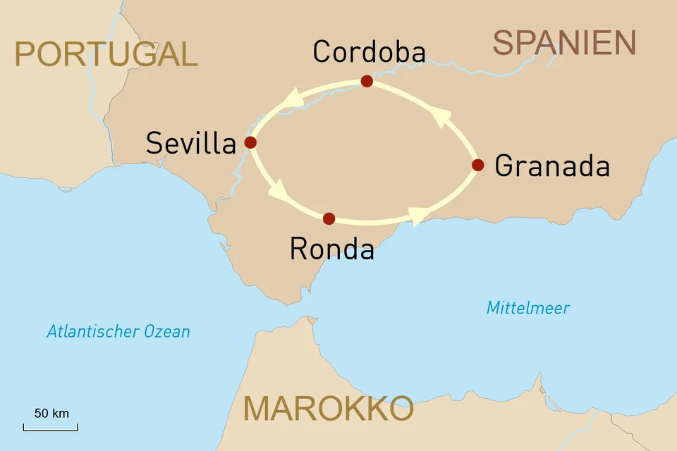 Diese Reise anfragenID: 41427Wir laden Sie ein, auf dieser Reise Andalusien, eine der beeindruckendsten Regionen Spaniens, reich an Geschichte und architektonischen Meisterwerken, kennenzulernen. Noch heute sind viele Spuren und Einflüsse aus der arabischen Zeit zu entdecken. Die Reiseroute führt Sie von Sevilla in die "Weiße Stadt" Ronda, weiter nach Granada und schließlich in die stimmungsvolle Stadt Cordoba. Ihr Fahrer bringt Sie zu den schönsten Plätzen bringen und gibt Ihnen die besten Tipps für Ihre Urlaubsgestaltung.