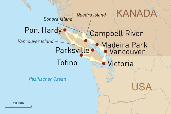 Diese Reise anfragenID: 54560Zu den Höhepunkten dieser Traumreise für Naturliebhaber und Genießer zählen Vancouver, Victoria, die Sunshine Coast mit ihren malerischen Küstenstädtchen und wildromantischen Stränden und Vancouver Island. Sie haben ausreichend Zeit, um Vancouver Islands faszinierende Kontraste mit dem Mietwagen zu erkunden. Man könnte meinen, Vancouver Island vereint Kanadas Vielfalt auf nur einer einzigen Insel. Ein unvergessliches Erlebnis bildet ein Aufenthalt im Sonora Resort inmitten der Natur und im Anschluss im Wickanannish Inn in Tofino. Freuen Sie sich auf vielfältige Naturerlebnisse, sei es eine Bärenbeobachtungstour, eine ausgiebige Wanderung oder ein Kajakausflug.